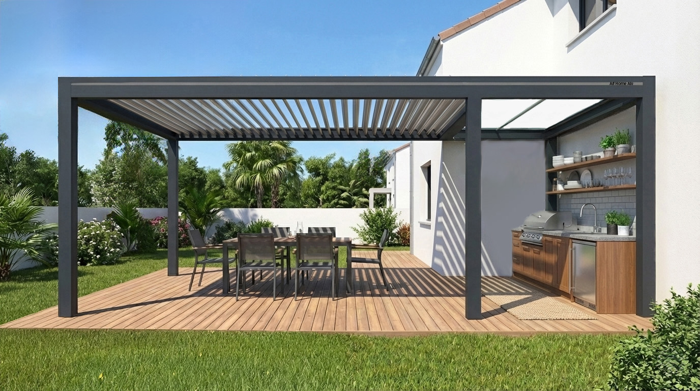 Le LUX ARKÉO DUO est une solution architecturale hybride qui associe un toit fixe et une pergola bioclimatique pour créer un véritable espace de vie extérieur, élégant et fonctionnel.